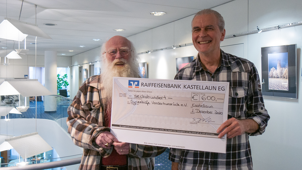 Die Raiffeisenbank Kastellaun eG hatte der Syrienhilfe Vorderhunsrück e.V. im Herbst die Gelegenheit gegeben, die im Jahr 2019 von der Künstlerin Frau Hannelore Castor gespendeten Gemälde in ihren Räumlichkeiten auszustellen und zum Verkauf anzubieten. Insgesamt 11 Bilder wurden im Rahmen der Ausstellung verkauft und so konnten nun insgesamt 600 Euro als Spende entgegengenommen werden. "Das Ergebnis ist nicht schlecht in diesem schwierigen Jahr. Angesichts des großen Elends und der vielen unterstützenswerten, uns bekannten Hilfs-Initiativen rund um Syrien und an den Grenzen Europas, hoffen wir natürlich weiterhin auf noch mehr Spenden zum Jahresende auf unser Konto", erwähnt der Vereinsvorsitzende Dr. Wilhelm Berger im Rahmen der Scheckübergabe. Vorstandsmitglied August von Dahl bedauert, dass es 2020 nicht, wie in den Jahren davor, auf Stadtfesten oder dem schönen Weihnachtsmarkt in Kastellaun die Möglichkeit gab, die Arbeit des Vereins zu präsentieren, für eine Mitgliedschaft zu werben und Spenden zu sammeln. "Zur Zeit ist die Not in den Flüchtlingslagern wieder so groß, dass wir das Geld schnellstmöglich weiterleiten. Diesmal wird es wieder an die Zeltschule e.V. in der Bekaa Ebene gehen, wo nun bittere Kälte herrscht und durch die katastrophale Lage im Libanon kaum staatliche Hilfen zu erwarten sind. Durch die Zeltschule werden 22000 Menschen unterstützt, Kinder beschult und ihre Familien mit Lebensmitteln versorgt." Der Vorstand der Syrienhilfe Vorderhunsrück hält immer Kontakt zu verschiedenen Kooperationsorgansiationen und kann so die sinnvolle Verwendung der Spendengelder garantieren. ( Spendenkonto: Syrienhilfe Vorderhunsrück e. V. IBAN: DE91560517900112224639)