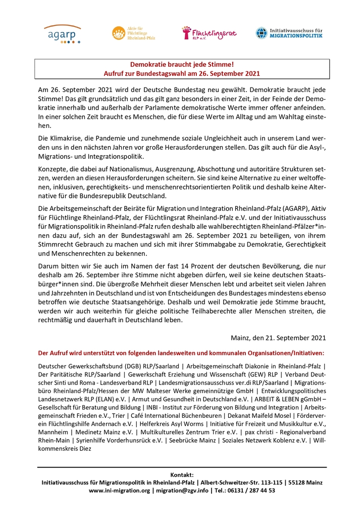 Aufruf rheinland-pfälzischer Einrichtungen der Integrationsarbeit zur Bundestagswahl 2021: