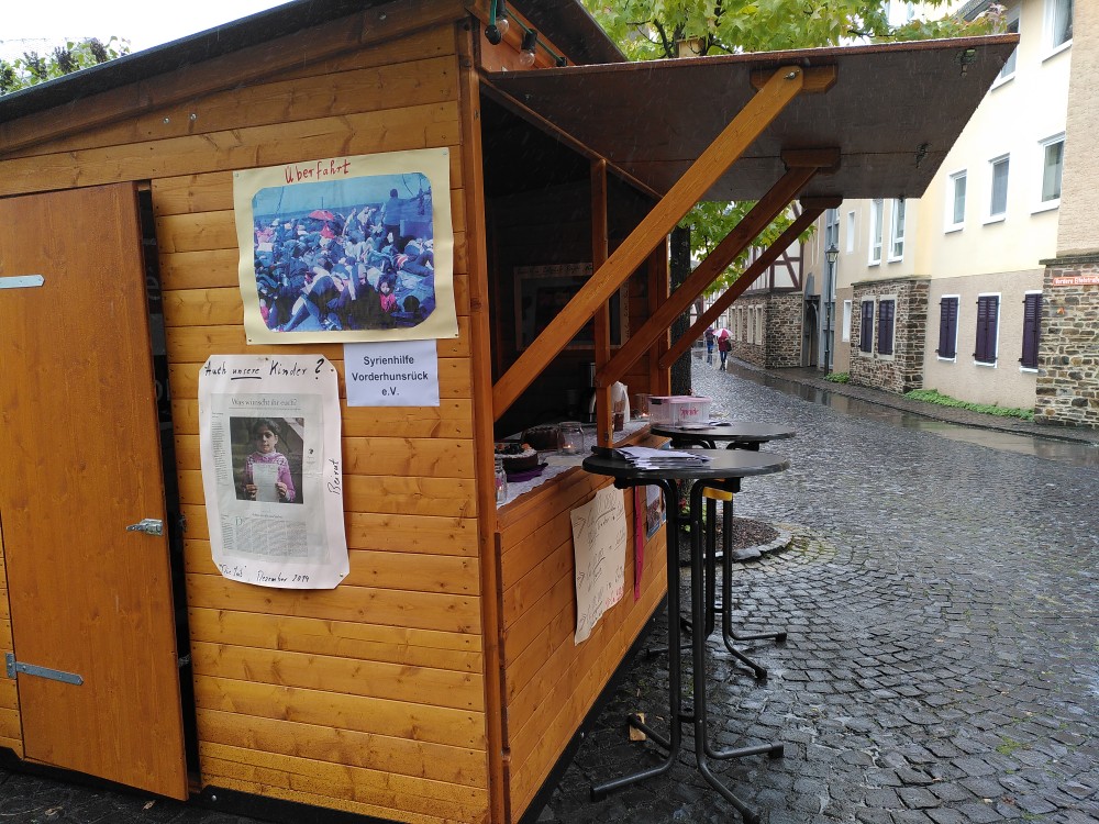 Es war eigentlich ein trostloser Tag: Regenschauer hielten schon am Vormittag potenzielle Besucher:innen davon ab, das Bürgerfest in Kastellaun zu besuchen. Aber die Mitglieder der Syrienhilfe Vorderhunsrück zeigten Präsenz und bauten ihren Stand wieder einmal auf. Am Nachmittag klarte es dann auf und das erwartete Publikum kam dann doch noch. So kam es wieder einmal zu guten Gesprächen über das Thema Krieg und Geflüchtete aus Syrien. "Leider ist es seit einigen Jahren durch neue Hygienekonzepte nicht mehr möglich, frisch gebackene Falafel am Stand anzubieten, das war immer ein echter Publikumsmagnet". Die Engagierten bedauern sehr, dass sie so dieses "Alleinstellungsmerkmal" nicht mehr haben. Trotzdem gab es Interesse an dem angebotenen leckeren Gebäck und sogar einige Spenden wurden in die aufgestellte Box geworfen. Ausgelegtes Infomaterial bot die Möglichkeit, das Thema "Krieg in Syrien" wieder einmal in das Bewusstsein der Interessierten zu rücken. Wie immer wird der Verein auch beim Weihnachtsmarkt in Kastellaun an zwei Tagen präsent sein, also noch eine Gelegenheit, die Arbeit der Öffentlichkeit darzustellen.