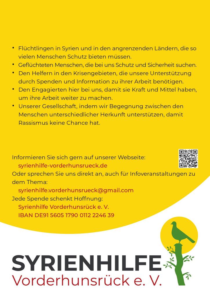 Unser neues Logo und der neue Flyer sind da! Nach fast 10 jährigem Bestehen des Vereins war eine Neugestaltung notwendig. Uns war es wichtig, die Friedenstaube als Hoffnungssignal in das neue Logo aufzunehmen, hoffen wir doch auf eine mittelfristige Besserung der humanitären Lage und auf ein Ende des grausamen Krieges in Syrien. Für den Flyer im Postkartenformat hat uns der Maler Khaled Hussein die Erlaubnis gegeben, eines seiner Bilder zu verwenden. Nach der erfolgreichen Ausstellung seiner Bilder bei uns im Hunsrück im Café International Büchenbeuren waren wir so begeistert von der Begabung des Künstlers, das Elend des Krieges und gleichzeitig die Hoffnung für die Menschen darzustellen. Dieses sind die beiden Pole, die auch unsere Arbeit als Verein begleiten. DANKE Khaled Hussein und DANKE Provinzial Rheinland, die uns ermöglicht hat, ohne zusätzliche Spendengelder für diesen Zweck unsere Öffentlichkeitsarbeit und gleichzeitig auch unsere Begegnungsarbeit so auf den aktuellen Stand zu bringen!
