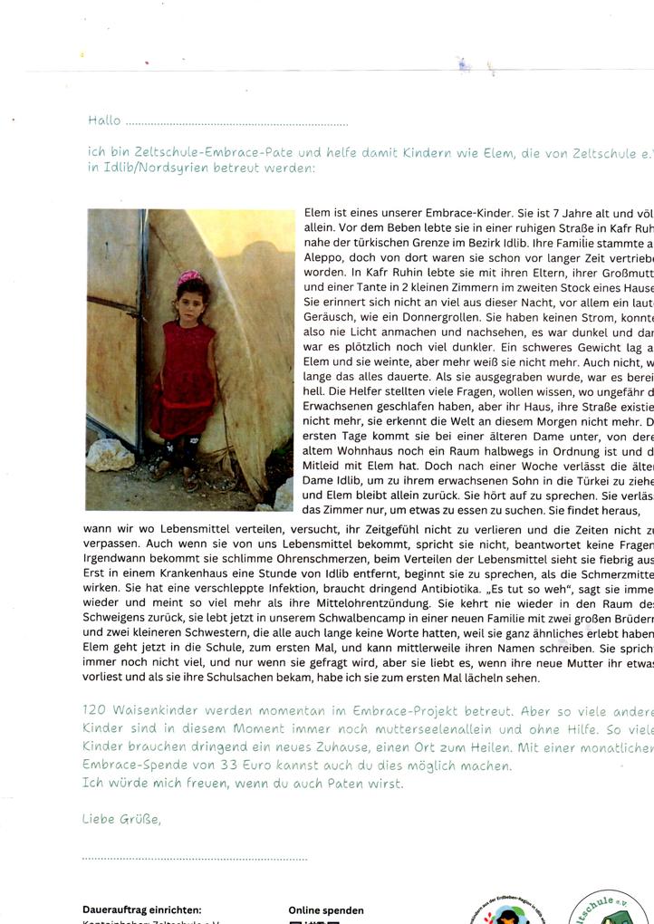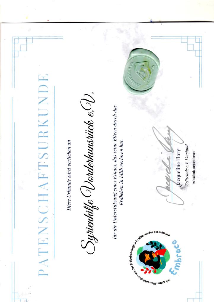 Das Erdbeben vor einem Jahr hat unvorstellbares Elend über die Menschen in Nord-Syrien gebracht. Gerade Kinder sind davon besonders hart betroffen, da sie oft zu Waisen wurden. Patenschaften sind ein sinnvolles Modell, um z.B. Waisenkinder langfristig zu unterstützen. Bei unserem letzten Arbeitstreffen beschlossen wir, als Verein eine Patenschaft für ein Kind im Erdbebengebiet zu übernehmen. Diese Patenschaft ist für die kommenden 2 Jahre schon vorfinanziert durch unser Spendenaufkommen, so dass der Betrag von 33 Euro pro Monat gewährleistet ist.