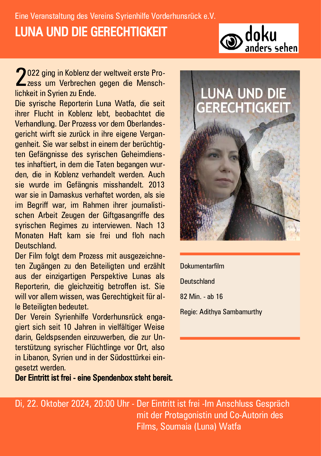 Der Eintritt ist frei - eine Spendenbox steht bereit. m Anschluss Gespräch mit der Protagonistin und Co-Autorin des Films, Soumaia (Luna) Watfa