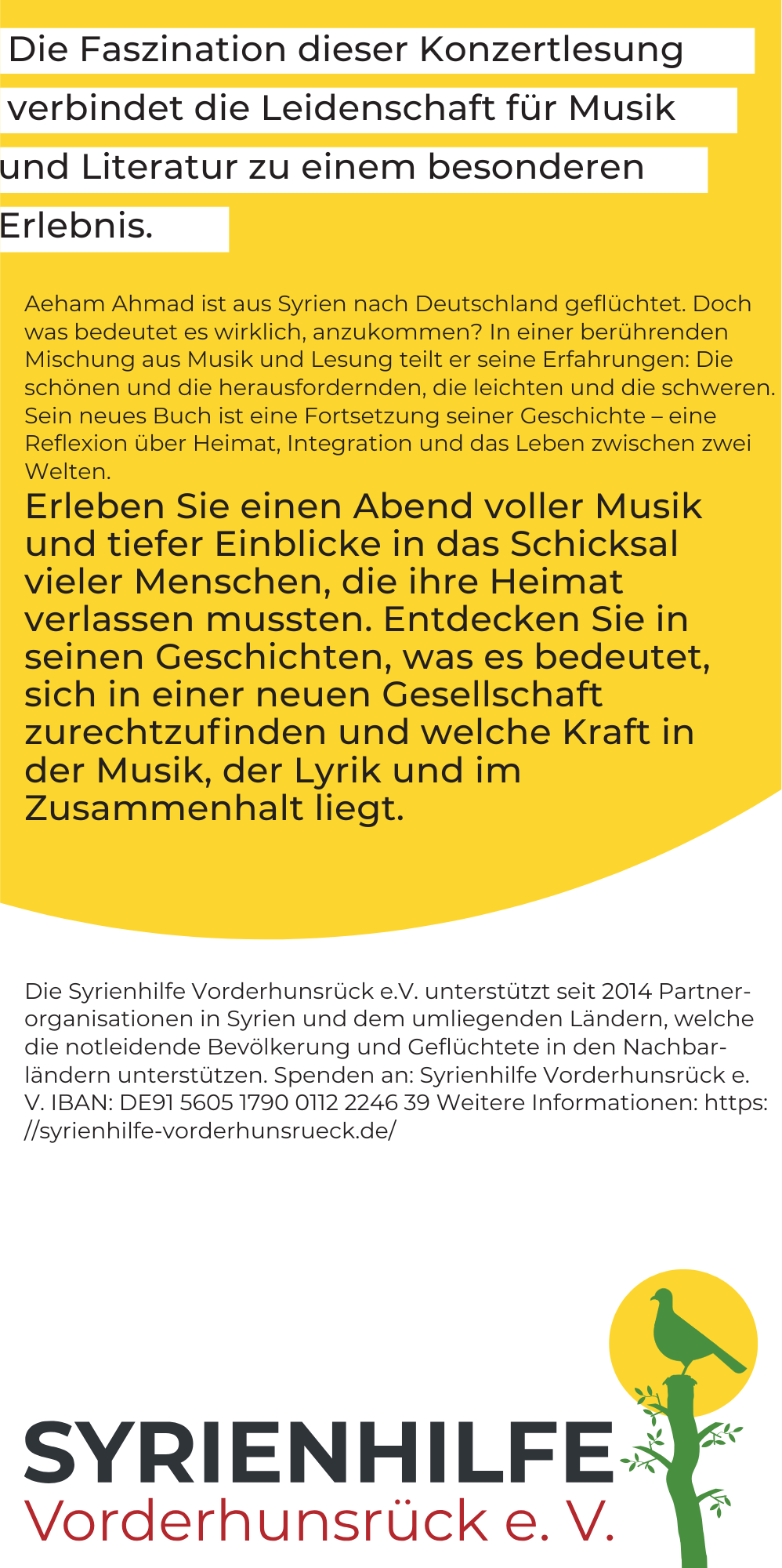 Die Faszination dieser Konzertlesung verbindet die Leidenschaft für Musik und Literatur zu einem besonderen Erlebnis. Aeham Ahmad ist aus Syrien nach Deutschland geflüchtet. Doch was bedeutet es wirklich, anzukommen? In einer berührenden Mischung aus Musik und Lesung teilt er seine Erfahrungen: die schönen und die herausfordernden, die leichten und die schweren. Sein neues Buch ist eine Fortsetzung seiner Geschichte – eine Reflexion über Heimat, Integration und das Leben zwischen zwei Welten. Erleben Sie einen Abend voller Musik und tiefer Einblicke in das Schicksal vieler Menschen, die ihre Heimat verlassen mussten. Entdecken Sie in seinen Geschichten, was es bedeutet, sich in einer neuen Gesellschaft zurechtzufinden und welche Kraft in der Musik, der Lyrik und im Zusammenhalt liegt.