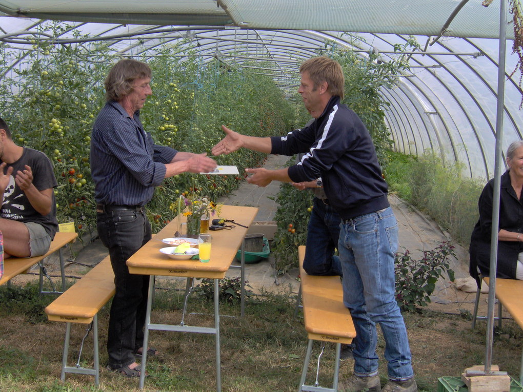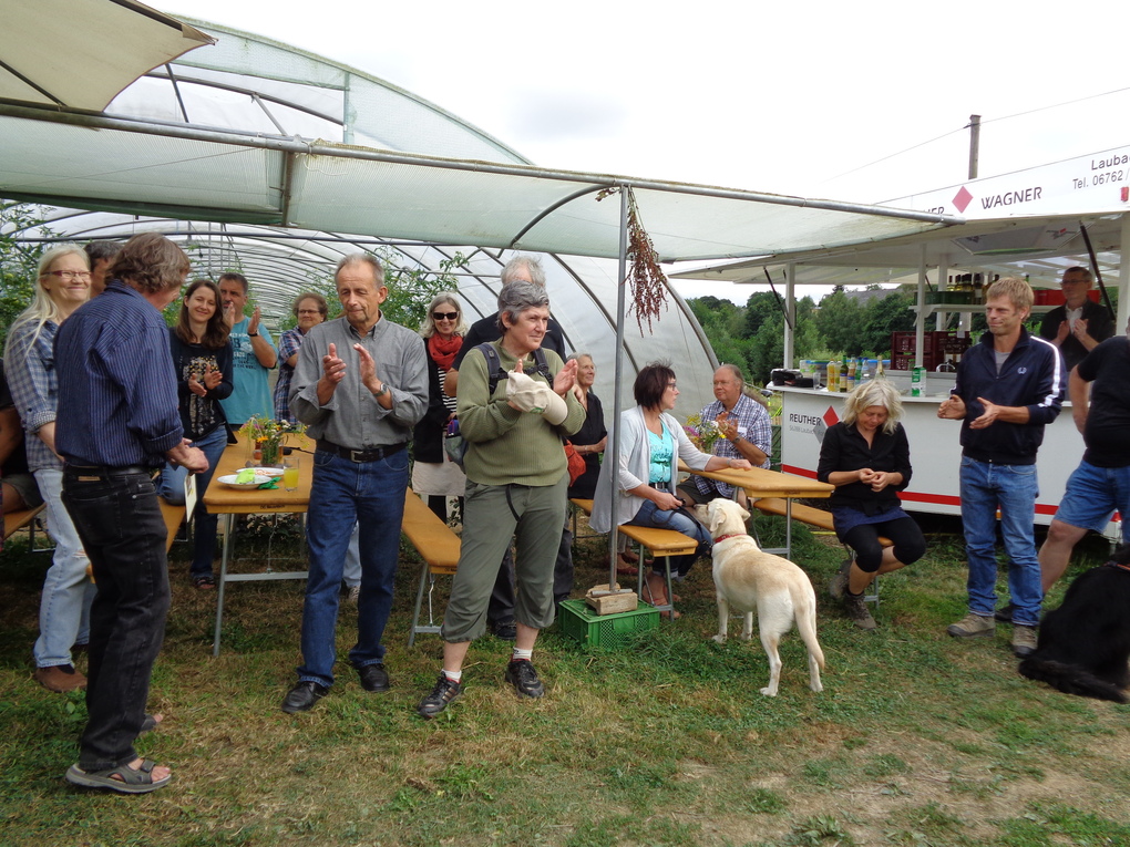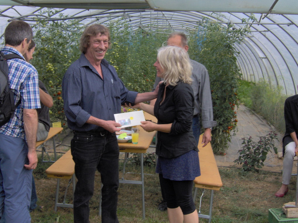 Jetzt konnten die Betreiber des Projekts, Ragna und Basti Stemmer, ihr zehnjähriges erfolgreiches Bestehen feiern. Dazu hatten sie auf ihren Acker eingeladen und ein vegetarisches Buffet vorbereitet. Aus diesem Anlass wurde der Syrienhilfe Vorderhunsrück eine beeindruckende Geldspende in Höhe von 500 Euro überreicht.