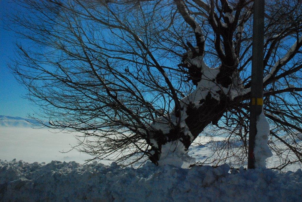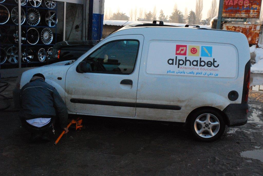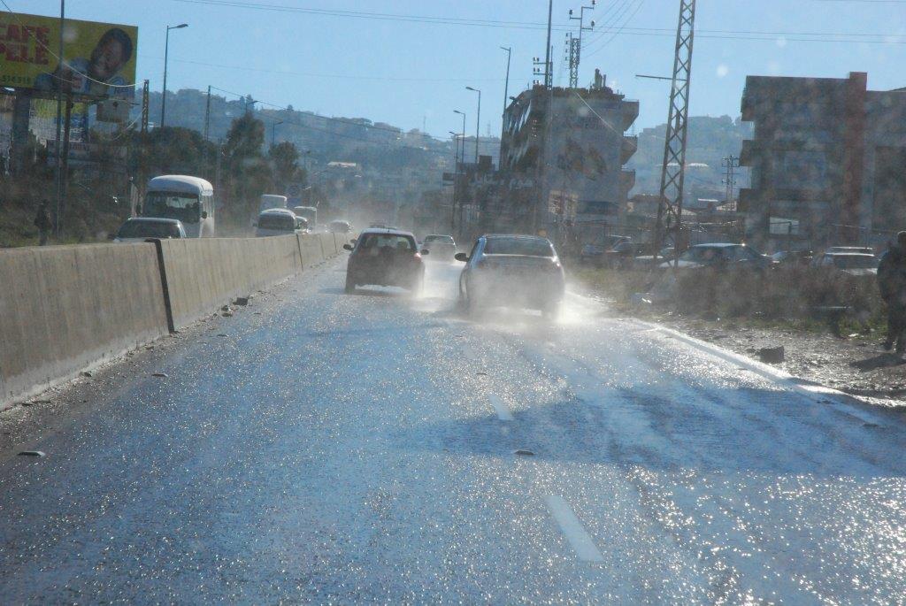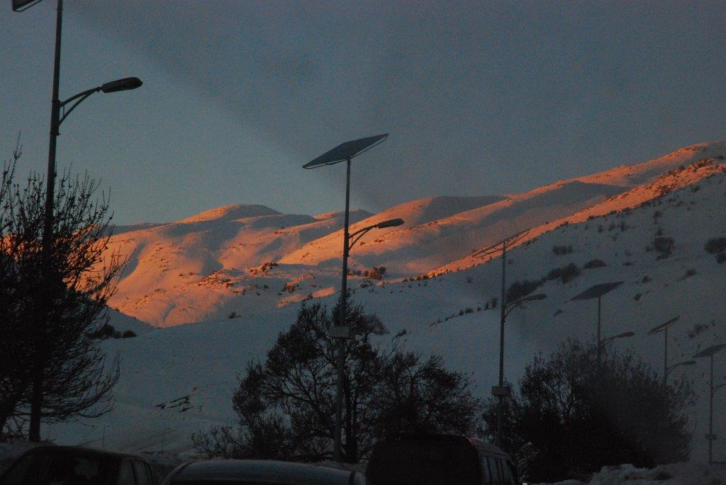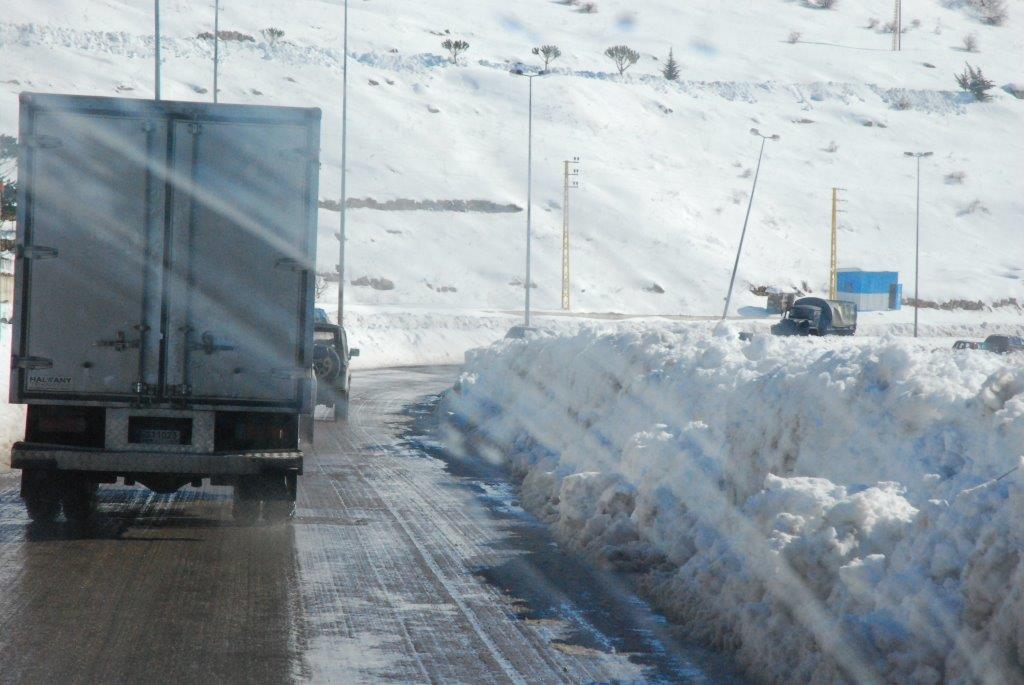 Aufbruch am 12. Januar um 9 Uhr. Aufgrund der Wetterverhältnisse (50-60 cm Neuschnee im Libanon, 30-40 cm in der Bekaa-Ebene in ca. 1.100-1.200 Metern Höhe) mit geländegängigem Fahrzeug . Strahlender Tag, 12 Grad in der Innenstadt, orientalischer Verkehr und orientalische Fahrweise von Mahmud, unserem Fahrer. Eingepackt sind unsere drei großen Koffer, zwei Taschen und ein Rucksack mit den gespendeten Wintermützen, Schals und Handschuhen. Dazu viele andere Gebrauchsgüter für die Kinder. Wir holen in der Innenstadt Nasrim ab, Mitinitiatorin dieses Schulprojekts "Alphabet" in den Flüchtlingscamps. Dann geht es hoch. Die Außenbezirke Beiruts liegen bereits auf 700 Metern ,der Anstieg ist enorm. Lief anfangs noch das Tauwasser in Strömen die Straße hinunter, ist es hier oben schon dicht verschneit. Schneeberge links und rechts, Lastwagen quälen sich mit bereits angelegten Schneeketten die Berge hoch. Vor zwei Tagen war alles noch unpassierbar - wir befinden uns auf der Hauptachse Beirut - Damaskus. Vor uns uns links seitlich türmt sich der schneebedeckte Libanon, unter uns im Sonnenglanz die Stadt am Meer, dazwischen Palmen, Zedern, Pinien. Wir selbst im chaotischen Verkehr.