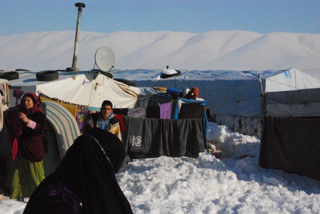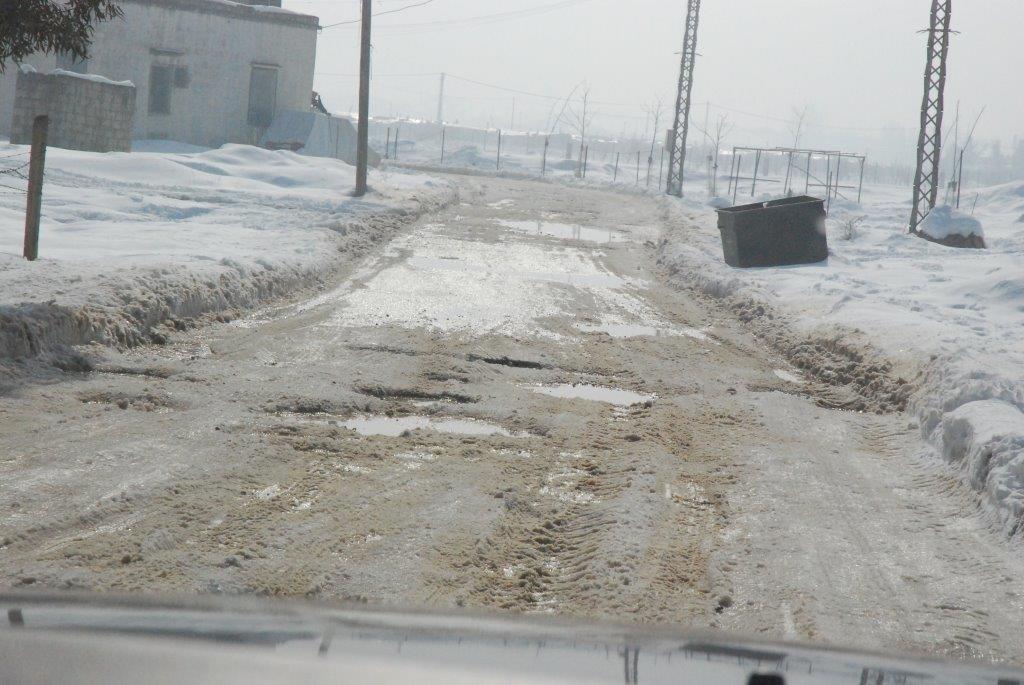Nach gut einer Stunde haben wir die Passhöhe (1.750 Meter) erreicht. Der Checkpoint - schwer bewacht – lässt erstmals den Ernst der Lage erahnen. Herrlicher Blick vom Libanon auf die Wolkendecke des Bekaa und den in der Ferne aufschimmernden Antilibanon. Schnee türmt sich links und rechts - zähflüssiges Vorankommen. Nach einer weiteren Stunde ist das erste Camp auf schneebedeckten, häufig mit Tauwasser gefüllten Schlaglöchern erreicht. Dazwischen verlassene Gehöfte, kleine Städte, orientalisch buntes Straßenbild und: überall Flüchtlinge. Meist Ältere und Kinder, Kleidung gerade noch ausreichend bis unzulänglich. Die Armut springt uns ins Gesicht.