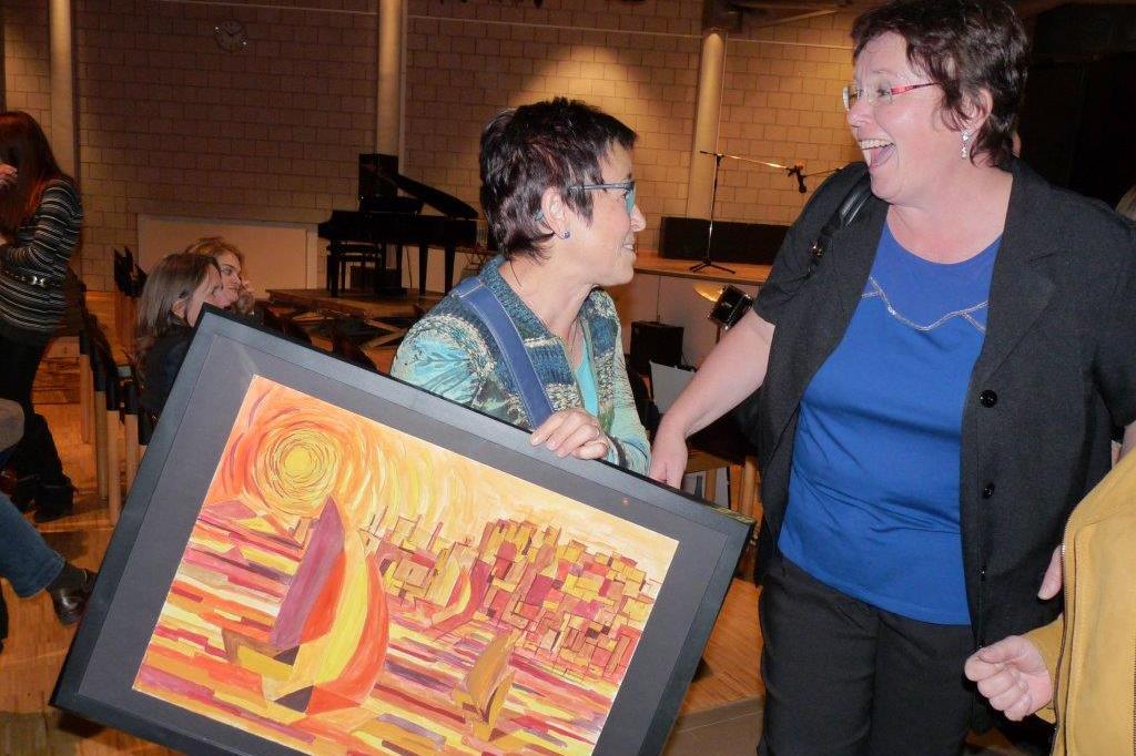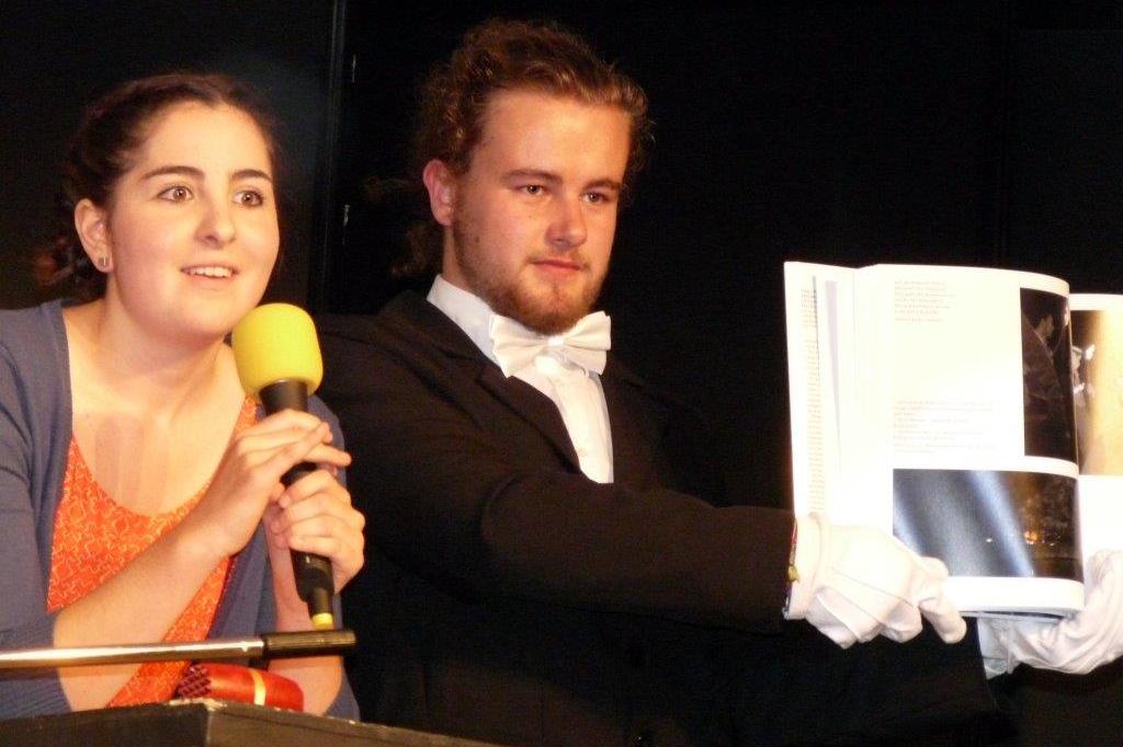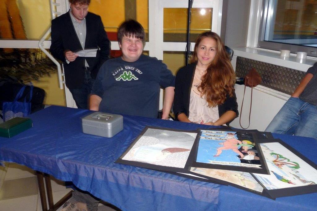 Höhepunkt des Abends war sicherlich die Kunstauktion. Zu diesem Zweck hatten die Schüler „vergessene Kunstwerke“, sprich Mal- und Zeichenarbeiten hervorgeholt, die von Kiara Tietze mit Witz und Engagement dem Publikum angepriesen und schließlich zu Preisen bis 120 Euro versteigert wurden. Auch ich habe mitgeboten und mein Arztzimmer schmückt jetzt eine orientalisch/kubistisch anmutende Darstellung. Der Bildband „Chronik einer Sehnsucht“, original signiert von Edgar Reiz, war schließlich Endpunkt der Versteigerung. Kiara verstand es die Spannung bis zuletzt hochzuhalten und der Bildband ging schließlich für 220 Euro an den neuen Eigentümer.