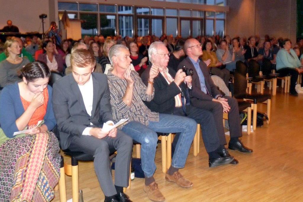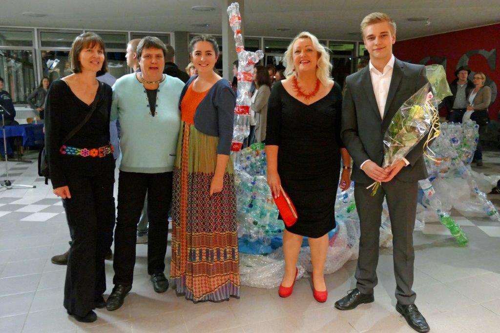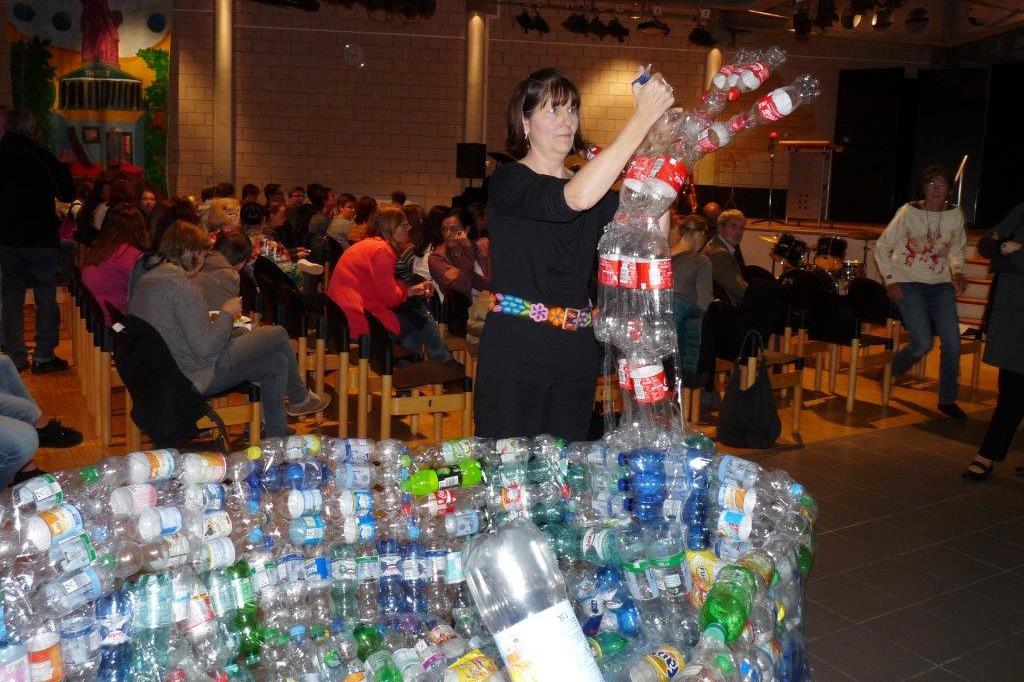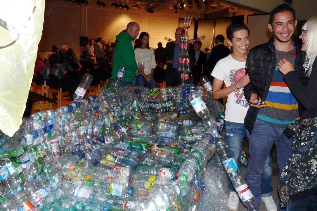 Am milden Frühherbstabend des 18. September war es dann soweit. Ich fand mich zusammen mit vielen geladenen Gästen aus Eltern, Lehrern und Schülerschaft in der Aula der IGS ein. Zentraler Blickfang am Eingang war das Gestalt gewordene Motto des Abends, „Alle in einem Boot“: ein sechs Meter langes und mindestens zwei Meter breites Wikingerboot, von Schülern gefertigt, aus leeren Plastikflaschen der Schüler. Eine großartige Idee, denn jedem war unmittelbar verständlich, um was es hier geht.