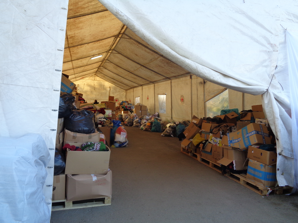 Kleider, Babynahrung, Windeln, Decken, Schuhe werden in den Lagerraum gehievt – insgesamt fünf Tonnen. Es geht auf den Abend zu und wird zunehmend frisch. Immer mehr freiwillige Helfer in orangefarbenen fluoreszierenden Westen eilen in das Warenlager, um Säcke mit Decken teilweise auf Sackkarren herauszufahren.