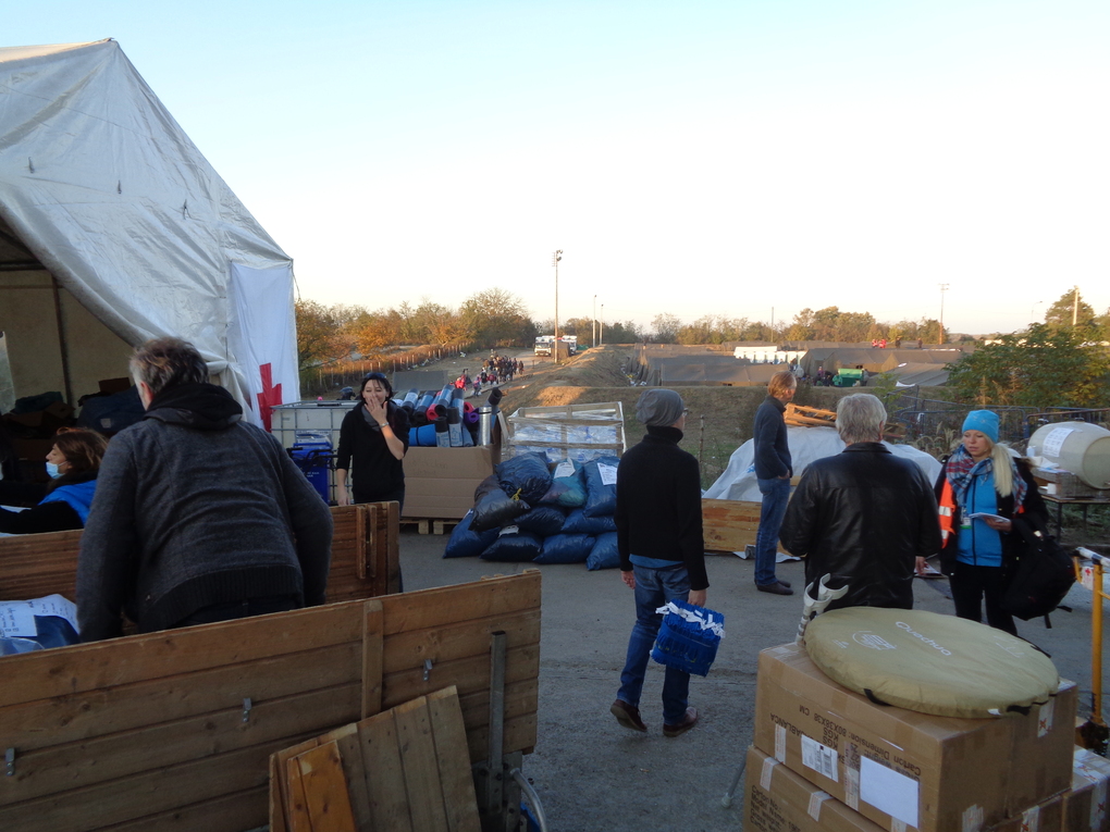 Das Lager in Opatovac wird in den nächsten Tagen geschlossen und ein winterfestes größeres in Slavonski Brod ca. 130 Kilometer entfernt eröffnet. Unter der Woche sind 130 ehrenamtliche im Einsatz, am Wochenende manchmal nur um die 40. So haben inzwischen auch auch Felix, Jenny und Ingrid – auch ohne akkreditiert zu sein – Helferwesten an und eilen mit Säcken mit Decken oder Babynahrung zu den Flüchtlingen, bis Tomislav Einhalt gebietet: „Ohne Akkreditierung kann das Ärger mit der Polizei geben und wir müssen schließlich mit ihnen zusammenarbeiten.“ Alles ist streng organisiert, die Flüchtlinge werden nach Kontrolle der Ausweispapiere und Registrierung mit Kleidung und Essen erstversorgt und dann in Gruppen wieder aus dem Lager geleitet, wenn wieder ein Bus bereitsteht, der sie an den Bahnhof nach Tovarnik bringt. Von dort bringt ein Zug die Flüchtlinge an die slowenische Grenze.