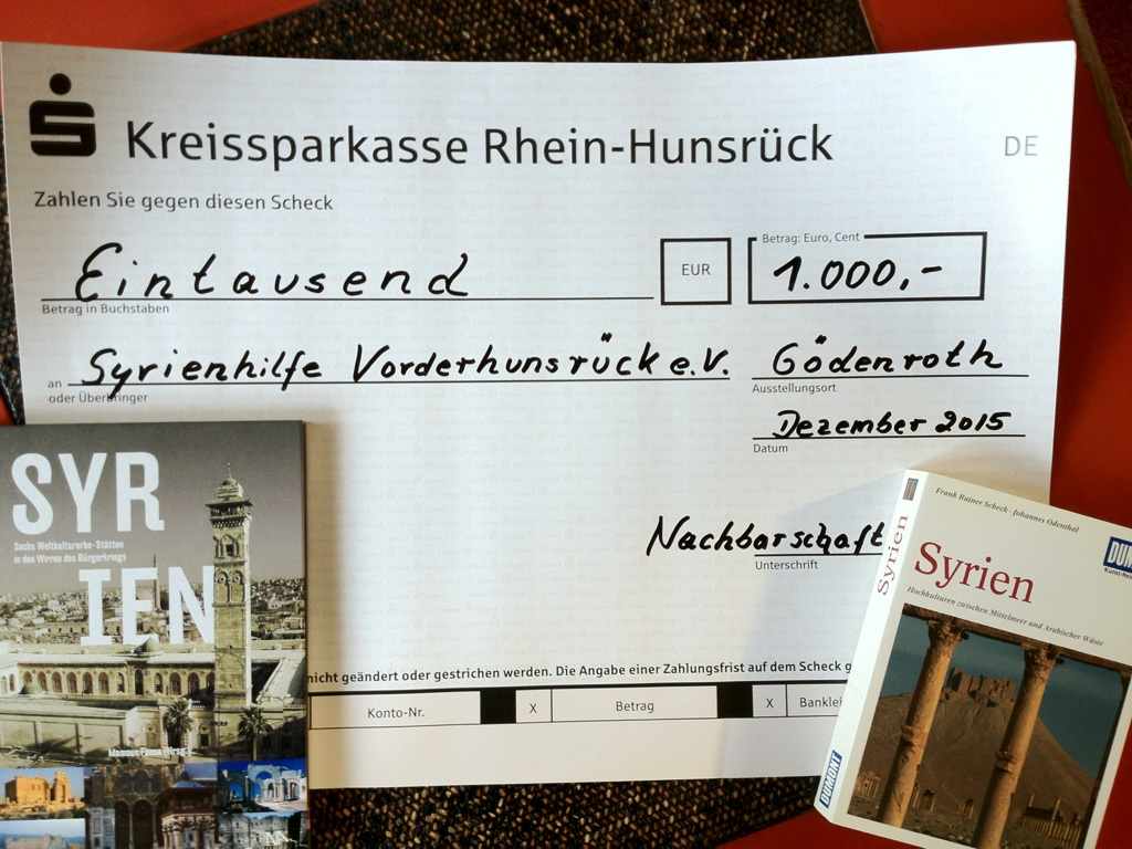 Ein großer Spendenscheck über 1000 € kam auch aus Gödenroth, wo man den Erlös des Weihnachtsmarktes übergab. So hat die Syrienhilfe-Vorderhunsrück wieder eine wesentliche Unterstützung unserer Projekte erfahren und kann auch weiterhin unsere ausgewählten Partner in der Vorort-Hilfe in den Krisengebieten unterstützen.