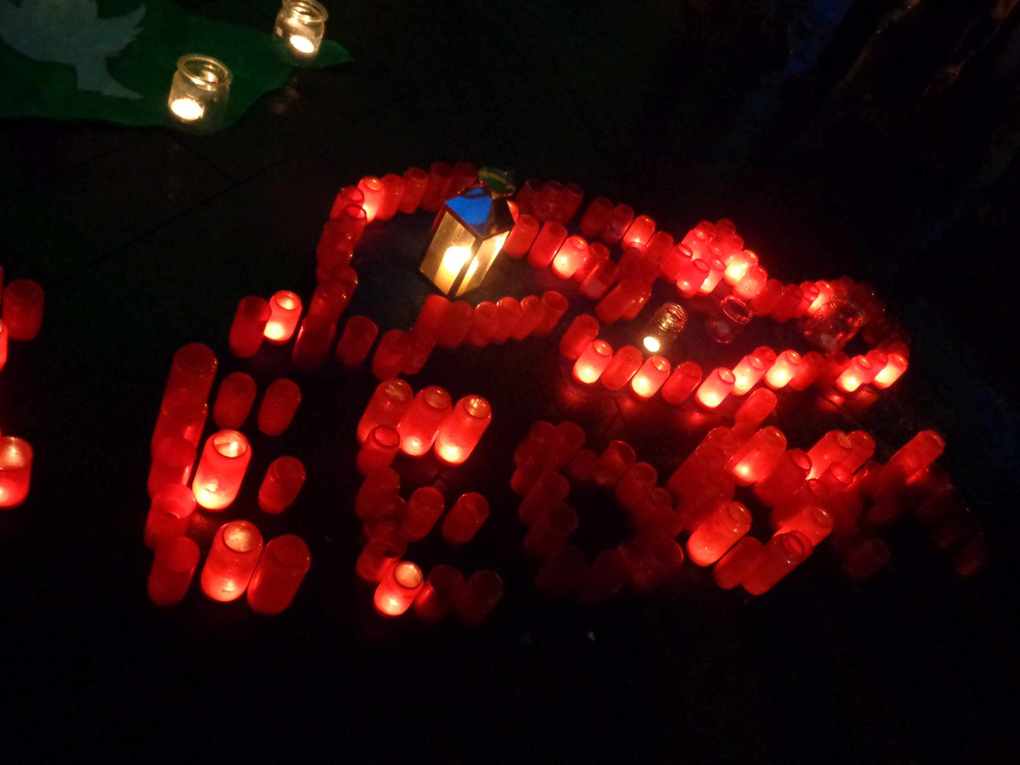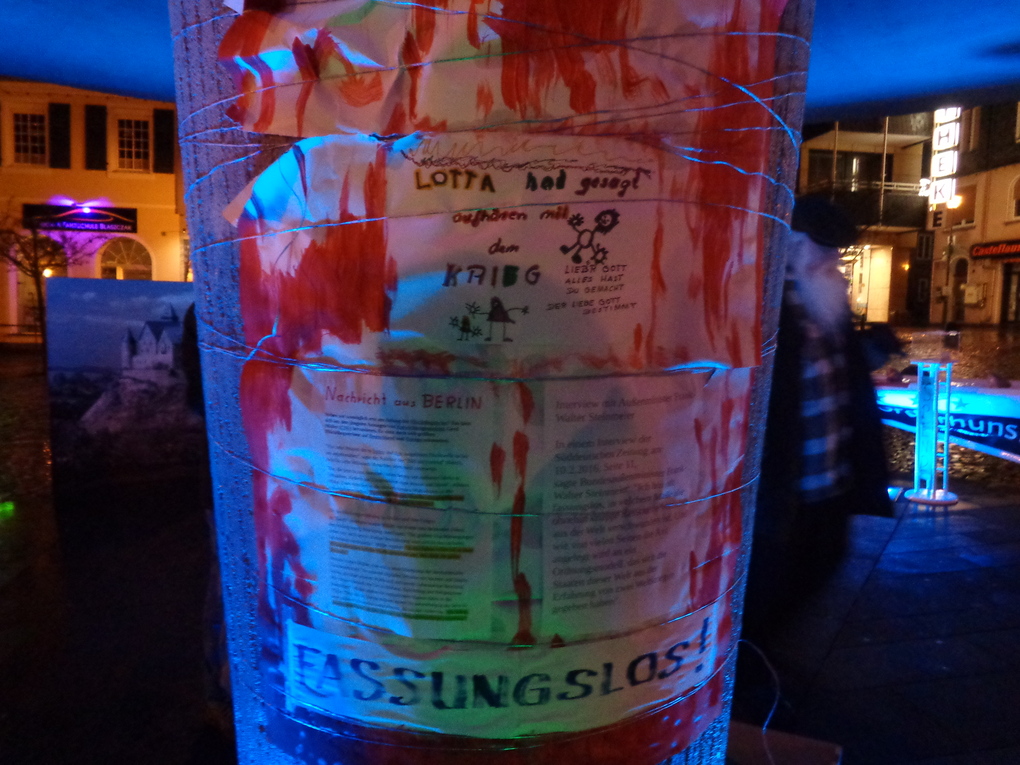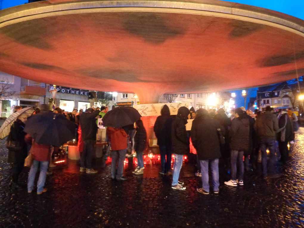 Sturm, Dauerregen und mäßige Temperaturen haben ca. 120 Personen nicht davon abgehalten sich mit Kerzen, Gläsern, Laternen, selbst gemalten Transparenten und vor allem mit ihren Überzeugungen von einem humanen und friedlichen Miteinander auf dem Marktplatz in Kastellaun einzufinden. Nach wiederholten Versuchen gelang es, die Kerzen anzuzünden und irgendwie vor dem starken Wind zu schützen. Der "Betonpilz" am Markt bot ein wenig Regenschutz.
