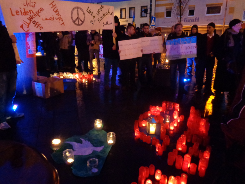 Es war eine gute Gelegenheit für Begegnungen zwischen Menschen, die aus mehr oder weniger hoffnungslosen Umständen zu uns gekommen sind, und uns, die wir in einem sicheren Umfeld leben. Ein Zeichen der Verbundenheit und des Mitfühlens mit der desaströsen Situation besonders in Syrien zu setzen, war das zentrale Anliegen dieser Stunde zwischen 18 und 19 Uhr. Der stärkste Moment war wohl die fünfminütige Stille, die auf Wunsch der Anwesenden eingehalten wurde. Das gemeinsame Schweigen bei Kerzenlicht in Wind und Regen war Ausdruck von Schmerz, Mitgefühl, Zweifel, Ratlosigkeit ob all der Gewalt, gemeinschaftlicher Stärke und Hoffnung auf Humanität, Dankbarkeit für Demokratie, Wohlergehen, Helfen dürfen und können. Beim Blick in die Gesichter mancher Flüchtlingsfamilie meinte ich manchmal die Frage zu erkennen: Können/Sollen wir nach all den Jahren jetzt wirklich, endlich Hoffnung auf Besserung haben? Diese Mitmenschen hängen in hohem Grade von unserem Verhalten ab - und wir von ihrem! Mich hat das sehr bewegt (und auch besorgt).