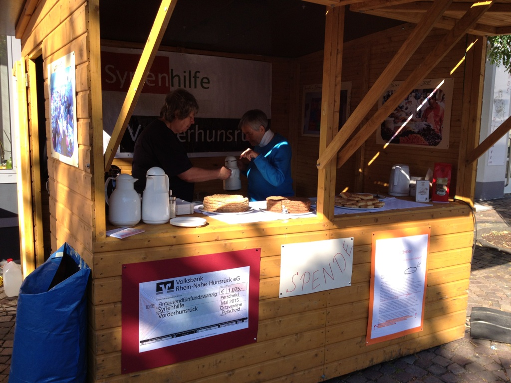 Die SYRIENHILFE dankt nochmals allen Mithelfern, die zum Gelingen des Tages beigetragen haben (Aufbau, Abbau, Kuchen backen, Anwesenheit, Vorbereitung, Transport, Kaffee- und Teespenden) ganz herzlich! Besonderen Dank an die Stadtverwaltung, die uns die Holzhütte/Stand kostenfrei zur Verfügung stellte.