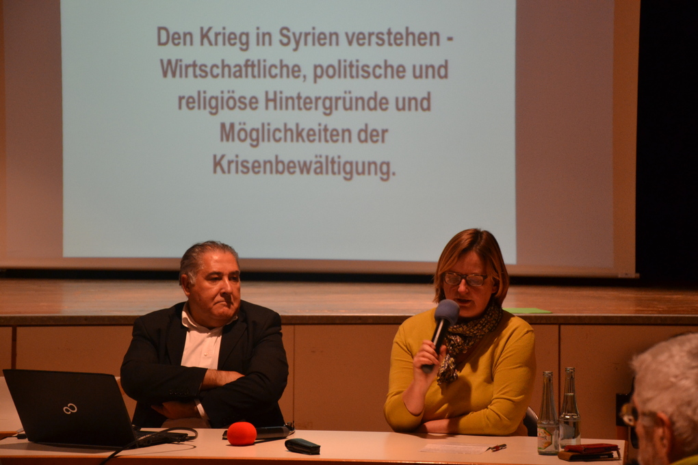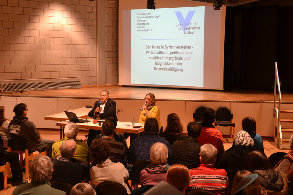 Auf Einladung der Flüchtlingsberatungs- und Ehrenamtskoordinationsstelle des Diakonischen Werk Trier und Simmern-Trarbach in Kooperation mit der Syrienhilfe-Vorderhunsrück e.V. kam der Nahostreferent der Gesellschaft für bedrohte Völker (GfbV), Dr. Kamal Sido, nach Kastellaun, um über die derzeitige Lage in Syrien zu informieren. Mehr als 70 Zuschauer hörten den Vortrag zur aktuellen politischen Lage aus dem Heimatland des Referenten, welches er in diesem Jahr zweimal bereist hat. Ziel des Vortrags war es, den Krieg in Syrien und damit die Fluchtursachen zu erklären. Viele Aktive der örtlichen Flüchtlingshilfe-Initiativen waren anwesend, teilweise begleitet von syrischen Geflüchteten, die in den letzten 2 Jahren bei uns im Hunsrück heimisch geworden sind. Auf großes Interesse stieß die Beschreibung der geschichtlichen Entwicklung des Landes, welche im letzten Jahrhundert von Fremdherrschaft geprägt war und jetzt wieder zum Spielball der Großmächte und anderer ausländischen Akteure geworden ist. Die Zusammensetzung des Landes aus vielen verschiedenen Volksgruppen und Religionen birgt viel Konfliktpotential. Die einzelnen Minderheiten leiden besonders und der Kampf gegen den Islamischen Staat ist ein wichtiges gemeinsames Ziel. Was das Regime und die Opposition verbindet, ist ein schmutziger Krieg gegen die Zivilbevölkerung, der ca. 8 Millionen Syrer in die Flucht im eigenen Land getrieben hat. Weitere Millionen sind in die Nachbarländer Türkei, Libanon und Jordanien geflüchtet. Ein geringer Teil floh nach Europa, davon ca. 600.000 nach Deutschland. Alle Geflüchteten hoffen auf erste Zeichen von Frieden in ihrem Heimatland. Im Norden des Landes gibt es schon Initiativen durch das Schaffen von Friedenszonen vor allem in den überwiegend kurdischen Gebieten. In der Diskussion zum Ende der Veranstaltung wurde die Vielschichtigkeit der Problematik deutlich. Dr. Sido wies immer wieder darauf hin, dass zum gegenwärtigen Zeitpunkt aus seiner Sicht die Kommunikation unter allen Beteiligten, unter Einbeziehung der USA und Russland, nicht abreißen darf. Okka Senst vom Diakonischen Werk und im Vorstand der Syrienhilfe war sich im abschließenden Resümee sicher, dass diese Veranstaltung eine gute Gelegenheit zum Austausch über Fluchtursachen geboten hat – und eventuelle Möglichkeiten einer friedlichen, politischen Lösung für das Land Syrien aufzeigen konnte. „Bei der Unterstützung der ehrenamtlichen Flüchtlingsbegleiter ist die Information über die Herkunftsländer ein zentrales Thema. Im Rahmen von Einzelveranstaltungen wie dieser können wir intensiveren Einblick in die komplexen Zusammenhänge bieten und danken darum Dr. Sido ausdrücklich für sein Kommen.“