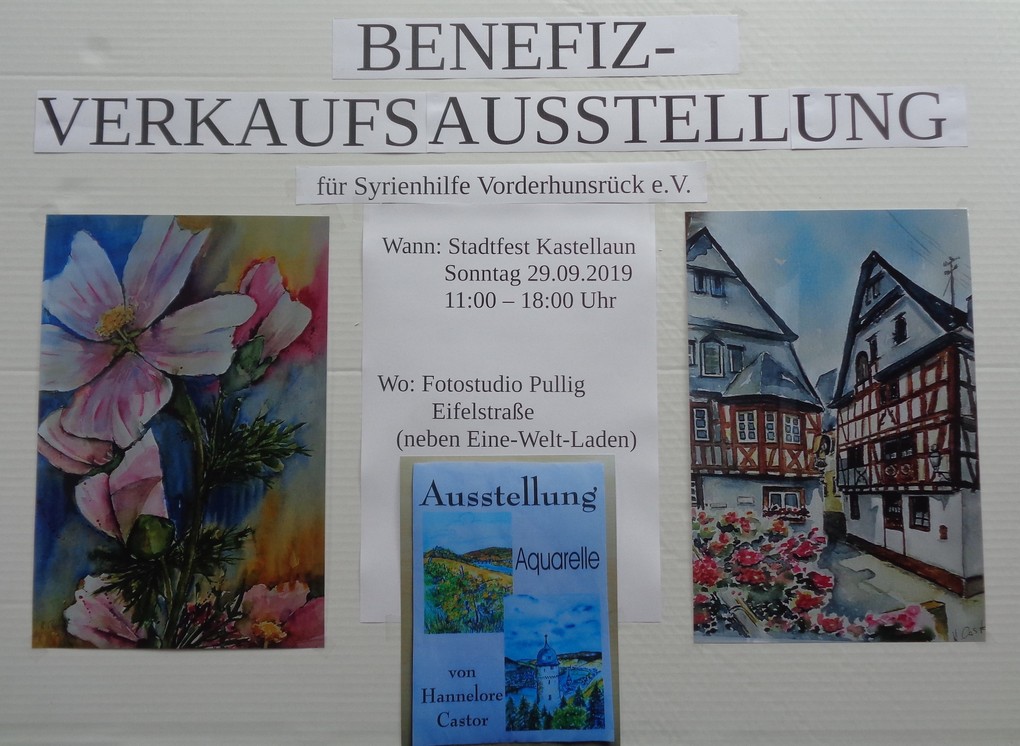 Beim Stadtfest in Kastellaun bietet die Syrienhilfe Vorderhunsrück e.V. im Fotostudio Pullig in der Eifelstrasse eine BENEFIZ-Verkaufsausstellung mit tollen Aquarellen der Künstlerin Hannelore Castor. KOMMT VORBEI UND SEHT TOLLE MOTIVE UND NUTZT DIE CHANCE, EIN TOLLES BILD ZU ERWERBEN!